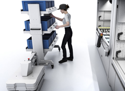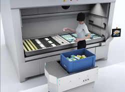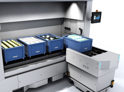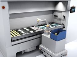 La préparation de commandes entièrement automatisée pour laquelle les robots MiR, équipés d’un module supérieur personnalisé, prélève, soulève et place les bacs ou les boîtes directement depuis ou vers le plateau du module de levage vertical (VLM), facilitant ainsi la préparation et le réapprovisionnement sans intervention humaine.