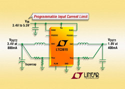 Le LTC3619 possède une fonction de limitation de la moyenne de l’intensité du courant d’entrée, programmable entre 200 mA et 1,2 A par une seule résistance, avec une précision de ± 5%. La régulation du canal 400 mA continue même si la limite de l’intensité d’entrée est atteinte. Ceci rend le LTC3619 idéal pour les applications à bus USB, la charge des super condensateurs et les alimentations de nœuds de charge. Associé à un super condensateur, le LTC3619 permet à son canal de sortie 800 mA de générer un courant dans la charge de forte amplitude sans faire tomber la tension d’entrée ou la sortie 400 mA pour les applications comme les amplificateurs GSM.