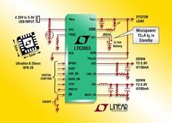 Le contrôleur PowerPathTM du LTC3553, avec gestion prioritaire automatique de la charge, assure le transfert d’énergie, sans défaut, entre plusieurs sources d’alimentation en entrée, pour alimenter la charge, tout en générant un courant de charge de batterie pouvant atteindre 400 mA à partir d’un port USB ou d’un adaptateur mural de 5 V. La limite du courant d’entrée peut être sélectionnée par une broche et fixée de façon interne (pas besoin de résistance externe). Le LTC3553 est compatible avec des tensions d’entrée jusqu’à 5,5 V (transitoire de 7 V max., pour une robustesse accrue). Le fonctionnement "marche immédiate" du composant assure l’alimentation de la charge du système même avec une batterie complètement déchargée.