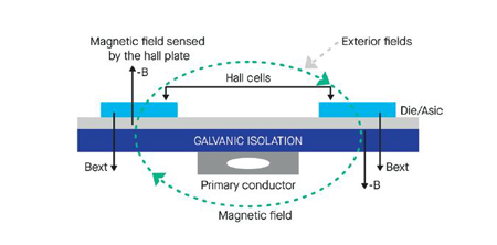 Les capteurs de courant à effet Hall classiques comportent un noyau magnétique autour du conducteur du capteur et des éléments de détection, afin de concentrer le champ magnétique. Ce noyau apporte également une protection contre les champs magnétiques externes et le bruit, deux paramètres indésirables. La mesure différentielle permet de se passer du noyau de ferrite, en utilisant deux éléments de détection (les cellules de Hall), qui reçoivent toutes les deux le champ magnétique à mesurer (l’un avec un facteur positif et l’autre avec un facteur négatif). La différence entre les deux champs permet l’annulation de tout champ magnétique extérieur supplémentaire non désiré.