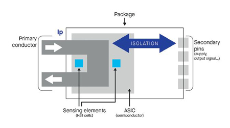 Certains systèmes ont besoin d’une isolation spécifique pour protéger l’utilisateur final, ce qui signifie que l’interface utilisateur doit être physiquement séparée du réseau haute tension (HT) et ne peut partager la même référence de tension. Les capteurs ICS intègrent une fonction d’isolation à l’intérieur du composant (isolation galvanique) et à l’extérieur du composant (distances de fuite et de contournement), ce qui signifie qu’il n’y a aucune connexion physique entre le conducteur primaire que traverse le courant et le circuit secondaire où se trouvent la puce de l’ASIC et les broches secondaires. Ces deux côtés communiquent entre eux uniquement via le champ magnétique produit par le courant circulant.