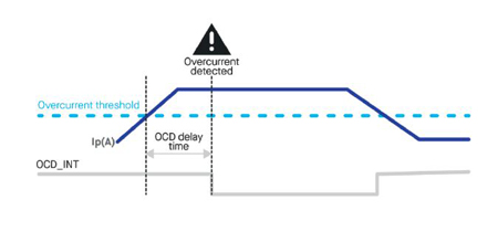 La détection des pics de courant est également une fonction importante. Grâce à la fonction OCD (over current detection) interne, si le courant dépasse le seuil défini, cela déclenche un signal de sortie spécifique sur une broche dédiée. Le microcontrôleur de l’application peut ainsi recevoir les informations d’alerte avec un minimum de délai. Sinon, l’action devrait être effectuée par le microcontrôleur lui-même en fonction du signal de tension proportionnel au courant envoyé par le capteur, et il prendrait beaucoup plus de temps.