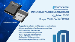 Innoscience, la société fondée pour créer un écosystème énergétique mondial basé sur des solutions d’alimentation à haute performance et à faible coût au nitrure de gallium sur silicium (GaN-on-Si), a annoncé aujourd’hui de nouvelles solutions à faible RDS(on), des dispositifs haute puissance dans sa famille toujours plus large de transistors de puissance à mode amélioré 650 V/700 V. De nouveaux modèles RON 30, 50 et 70 mÙ sont disponibles dans un boîtier TOLL (TO-sans broche) standard de l’industrie. La partie 70 mÙ est également disponible en modèle DFN 8x8.