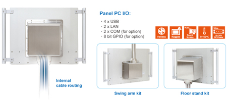 La série ABOS est disponible en 15.6 et 21.5’’ et dispose de 4x USB 3.2, 2x LAN, 2x COM, et en option de GPIO 8 Bits. Ce Panel PC est robuste et fiable avec sa coque en aluminium et sa face avant en Inox 316L. Le cache des E/S est intégré au kit de montage du bras oscillant flexible et est traité anticorrosion. Il rassemble tous les câbles d’E/S pour améliorer l’environnement de travail et simplifie l’installation. De plus ABOS est étanche IP65 sur toutes les faces pour une protection optimale contre la poussière et l’eau.