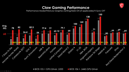 Selon des tests effectués en interne, la nouvelle version BIOS E1T41IMS.106 (référencée en tant que 106) et les nouveaux pilotes GPU 31.0.101.5445 (référencés en tant que 5445) pour la console MSI Claw donnent un coup de fouet impressionnant aux performances gaming. Par exemple, les performances du très apprécié « 7 ways to die », un jeu de survie horrifique en monde ouvert, bénéficient d’une optimisation allant jusqu’à 150 %. D’autres jeux très populaires tels que « Monster Hunter World » et « Cyberpunk 2077 » ont également vu leurs performances bondir de plus de 50 % grâce aux mises à jour du BIOS et des pilotes GPU. L’expérience gaming est par conséquent plus fluide et plus agréable pour le joueur.