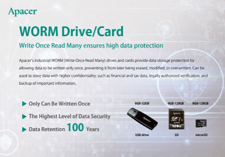 C’est maintenant aux consommateurs de décider si leur application bénéficiera de la technologie WORM. S’ils devaient choisir de l’adopter, ils peuvent alors être assurés que les disques WORM d’Apacer emmagasineront et préserveront leurs données de façon fiable, les stockant soigneusement et les restituant de manière fiable à chaque fois qu’elles devront être examinées pour en vérifier intégrité.