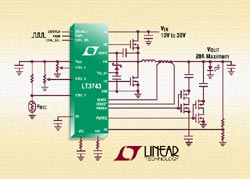 Le LT3743 possède deux contrôles de luminosité PWM et CTRL_SELECT, avec un rapport de luminosité de 3000 à 1, pour trois niveaux d’intensité de DEL, ce qui le rend idéal dans les applications de mixage de couleurs comme celles requises dans les projecteurs DLP. De même, l’architecture unique du LT3743 permet la transition entre deux DEL régulés en niveau d’intensité en moins de 2 µs, ce qui autorise un mixage plus précis des couleurs dans les applications RVB. La précision de l’intensité des DEL est de ± 6 % afin d’assurer la luminosité la plus précise à partir de la DEL. Les caractéristiques additionnelles incluent la régulation de la tension de sortie, la protection contre les DEL ouvertes (Open-LED), la protection contre les surintensités et un circuit de contrôle de dépassement thermique.