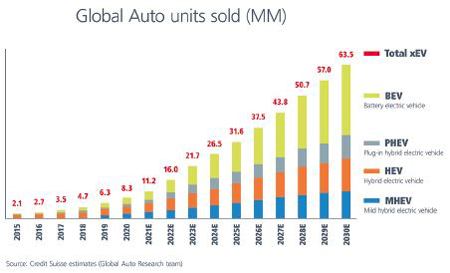 Pendant de nombreuses années, les volumes de production de véhicules électriques représentaient moins de 1 % de la production mondiale de véhicules dans le monde. Selon l’équipe de recherche Global Auto du Crédit Suisse, cette part passera de 11 % en 2020 à 62 % en 2030, atteignant les 63 millions de véhicules dans le monde. Parmi ceux-ci, près de la moitié, soit 29 millions, devraient être entièrement électriques (rechargeables).