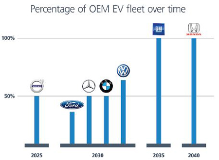 Mais quel est le moteur de cette croissance explosive du marché des véhicules électriques ? Bien que les normes relatives aux émissions et les programmes incitatifs du gouvernement aient été le premier levier, aujourd’hui c’est le désir des consommateurs qui nourrit cette demande croissante et qui fait que les OEM peuvent transformer un marché de niche en une véritable tendance. Ces constructeurs automobiles prennent aujourd’hui des engagement forts. (Figure 2).