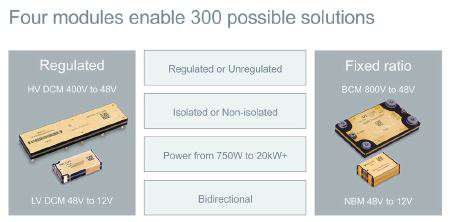 La modularité permet également des niveaux supplémentaires de flexibilité en autorisant des architectures d’alimentation distribuée basée sur un bus 48 V. Les modules d’alimentation peuvent être placés à des emplacements pratiques pour une conversion 48 V/12 V localisée, derrière la boîte à gants, à proximité du coffre ou près de chaque roue. Le déploiement d’une solution modulaire n’offre pas seulement la flexibilité de la conception, mais aussi un meilleur moyen de simplifier les changements de puissance et le processus de fabrication.