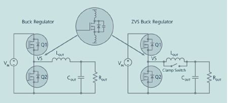 L’utilisation d’un interrupteur supplémentaire avec la technique ZVS permet au convertisseur de stocker une petite quantité d’énergie dans l’inductance de sortie lorsque les commutateurs du haut et du bas sont tous les deux ouverts. Le convertisseur utilise cette énergie qui était gaspillée pour décharger la capacité de sortie du transistor à effet de champ (FET) du haut et charger la capacité parasite du FET synchrone de sortie.
