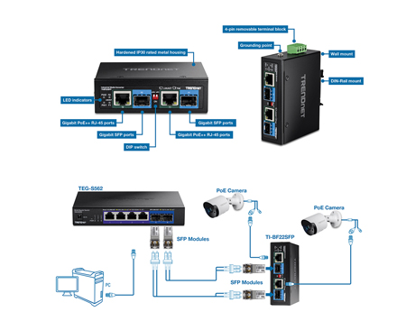 Sortie PoE++ : convertit la fibre longue distance en cuivre tout en alimentant les appareils compatibles PoE, PoE+ et PoE++, tels que les caméras IP et les points d’accès sans fil