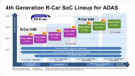 Renesas Electronics Corporation, l’un des principaux fournisseurs de solutions de semi-conducteurs avancées, élargi aujourd’hui sa célèbre famille de systèmes sur puce (SoC) R-Car pour les systèmes avancés d’aide à la conduite (ADAS) d’entrée de gamme. Les nouveaux SoC, la série R-Car V4M et l’extension de la série R-Car V4H existante, offrent une capacité de traitement de l’intelligence artificielle robuste et des performances CPU rapides, tout en équilibrant soigneusement les performances et la consommation d’énergie. Leurs performances TOPS/W exceptionnelles et leurs caractéristiques optimisées en termes de consommation d’énergie en font la solution idéale pour les applications ADAS d’entrée de gamme, sensibles aux coûts, telles que les systèmes de caméras intelligentes frontales, les systèmes de vision surround, les systèmes de stationnement automatique et les systèmes de surveillance du conducteur.