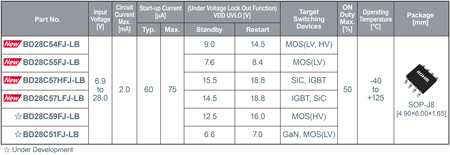 Les nouveaux produits présentent une plage de tension d’entrée de 6,9V à 28,0V, un courant de circuit de jusqu’à 2,0mA, un courant de démarrage maximal de 75µA et un facteur de marche maximal de 50%, proposés dans le boîtier standard SOP-J8 (équivalent au SOIC8 de JEDEC). Les produits sont compatibles broche à broche avec les produits standard couramment utilisés dans les circuits d’alimentation en courant, ce qui réduit les efforts de reconception et de modification. Toutes les variantes sont équipées d’une fonction de verrouillage en cas de sous-tension (UVLO) de type auto-récupération avec hystérésis de tension. Cela améliore considérablement la fiabilité de l’application en réduisant l’erreur de tension de seuil à ±5%, par rapport aux ±10% typiques des produits standard.