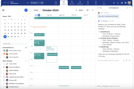 Zoom a introduit AI Companion pour les réunions en présentiel, permettant de fournir des résumés de réunion et des actions à suivre via l’application Zoom Workplace sur mobile. Pour les réunions au bureau, AI Companion s’intègre dans Workspace Reservation, en recommandant les jours optimaux de présence en fonction des coéquipiers présents, et en suggérant des salles adaptées en fonction de leur emplacement et taille. Cela facilite la coordination, la collaboration et l’optimisation des espaces de travail, renforçant ainsi l’efficacité des équipes sur site.