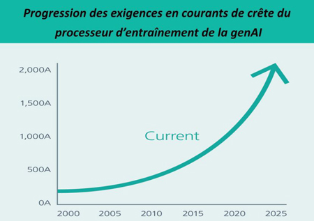 L’espace disponible sur la carte électronique des modules accélérateurs (AM) utilisés par les processeurs d’entraînement genAI est très limité, ce qui signifie que les sous-systèmes de distribution de l’alimentation pour ces processeurs doivent afficher une densité de puissance (W/mm2) et une densité de courant (A/mm2) très élevées. Les alimentations traditionnelles ne peuvent tout simplement pas atteindre la densité de puissance et de courant requises pour fournir le courant nécessaire et pouvoir être installées dans l’espace disponible de la carte électronique. Comme dit précédemment, les composants de puissance pour les processeurs d’entraînement de genAI doivent respecter les exigences sur le plan des performances dynamiques causées par les transitoires dus aux variations de charge. Une fois encore, les approches conventionnelles de distribution de l’alimentation ne sont pas adaptées pour ces exigences, en particulier car les processeurs d’entraînement de genAI nécessitent environ 3 mF de capacité de découplage aussi près que possible du boîtier du processeur.