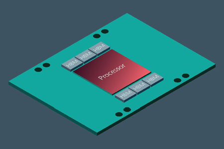 Figure 2. Module accélérateur de genAI conceptuel montrant le processeur genAI et la compatibilité avec des mémoires HBM (mémoires haute-vitesse empilées) utilisant un boîtier à micropuces :