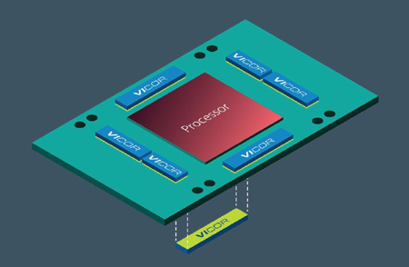 La régulation de la tension par abaissement et modulée en largeur d’impulsion (PWM) multi-phase peut être conceptualisée en tant que moyenne de courant, comme si on créait de l’eau tiède à l’aide d’un flux dynamique mélangeant de l’eau chaude (courant de crête maximal) et de l’eau froide (pas de courant). L’architecture FPA (Factorized Power Architecture™) de Vicor est fondamentalement différente et peut être conceptualisée comme une division de tension très efficace produisant une multiplication de courant. Les composants ChiP™, qui sont des multiplicateurs de courant modulaires, sont compatibles avec l’agencement de la carte électronique et permettent d’atteindre un large panel de niveaux de distribution de courant, le tout sans nécessiter beaucoup de travail de réingénierie.