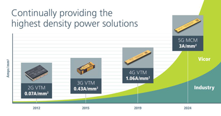 Figure 4 : Vicor a fourni les convertisseurs DC-DC de point de charge avec la plus forte densité de courant depuis plus de 10 ans sur quatre générations de produits Cette architecture de distribution de l’alimentation innovante est associée à la topologie de circuit SAC™ (Sine Amplitude Converter) à la pointe de la technologie, qui utilise les méthodes de commutation au passage à zéro de la tension et du courant ZVS et ZCS afin de minimiser le bruit de commutation ainsi que les émissions parasites rayonnées et maximiser l’efficacité de conversion DC-DC. La commutation MOSFET à haute fréquence réduit les dimensions physiques des modules Vicor à haut degré d’intégration :