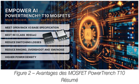 onsemi a introduit une série de familles 40 V et 80 V de la technologie PowerTrench T10. Le NTMFWS1D5N08X (boîtier SO8-FL 80 V, 1,43 mΩ, 5 mm x 6 mm) et le NTTFSSCH1D3N04XL (boîtier source down dual cool 40 V, 1,3 mΩ, 3,3 mm x 3,3 mm) offrent le meilleur facteur de mérite (figure of merit, FOM) de sa catégorie pour bloc d’alimentation (power supply unit, PSU) et convertisseur de bus intermédiaire (intermediate bus converter, IBC) dans les applications d’IA dans les centres de données. Ils atteignent une efficacité de 97,5 % du bloc d’alimentation et une efficacité de 98 % de l’exigence de l’IBC pour la spécification Open Rack V3.