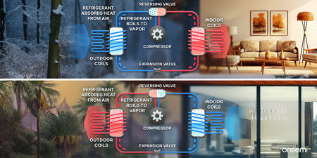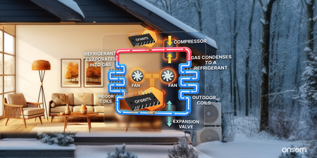 Les pompes à chaleur sont des technologies multifonctionnelles et économes en énergie, utilisées à la fois pour le refroidissement et le chauffage. Une pompe à chaleur peut modifier le sens du flux de réfrigérant grâce à une vanne d’inversion, ce qui lui permet de chauffer ou de refroidir une maison. Le processus implique le passage de l’air à travers un serpentin d’évaporation, facilitant le transfert de l’énergie thermique entre l’air et le réfrigérant. L’énergie thermique circule dans le réfrigérant et est ensuite libérée en passant par un serpentin de condensation sur lequel un ventilateur souffle. Au cours de ce processus, l’énergie thermique est transférée d’un endroit à un autre, comme le montre la Figure 1 ci-dessous. Les semi-conducteurs de puissance dotés de capacités de commande de moteur efficaces sont très demandés, dans la mesure où nous nous dirigeons vers un avenir sans émissions de carbone. Il est essentiel de réduire la taille et le coût global du système tout en augmentant son efficacité.