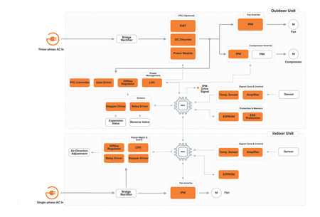 La mise en œuvre de nouvelles réglementations en matière d’efficacité énergétique pour les compresseurs et les pompes nécessite l’incorporation de moteurs à commande électronique, ce qui pose des défis supplémentaires aux concepteurs d’électronique de puissance. L’utilisation d’un système à onduleur avec un module de puissance intelligent (IPM) dans les refroidisseurs est largement reconnue pour sa capacité à réduire la consommation d’énergie de 30 % par rapport aux systèmes sans onduleur.