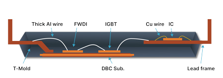 Pour les applications à haute puissance, la dissipation thermique du boîtier est essentielle pour garantir les performances requises. L’aspect crucial de la technologie de boîtier de haute qualité réside dans la capacité d’optimisation de sa taille tout en maintenant d’excellentes propriétés de dissipation thermique sans compromettre le degré d’isolation. Les dispositifs SPM31 utilisent la technologie de substrat DBC, permettant d’obtenir d’excellentes propriétés de dissipation thermique. Cette technologie a permis d’améliorer la fiabilité et la dissipation thermique. Les puces de puissance sont physiquement fixées au substrat DBC (Figure 5).