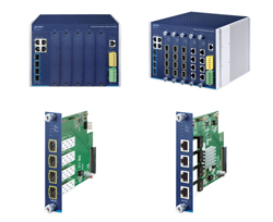 De par sa conception modulaire, il accueille jusqu’à 5 modules interchangeables et répond aux besoins de mise en réseau avec des options telles que 10/100/1000BASE-T et fibre Gigabit SFP. De plus, deux modules fixes fournissent 4 ports cuivre Gigabit et 4 ports SFP+ 10G, tandis que l’autre offre une entrée et une sortie numériques pour le contrôle et un bornier d’alimentation pour la redondance d’alimentation 12-48 VDC.