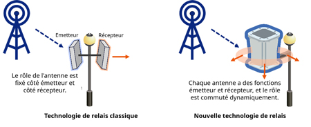 Dans la technologie de relais classique, les antennes sont désignées comme émetteur afin de recevoir les signaux des stations de base et comme récepteur pour les transmettre. La construction d’une zone nécessite d’ajuster les rôles et la direction de chaque antenne. En revanche, ce dispositif de relais permet à chaque antenne de basculer dynamiquement entre les fonctions émetteur et récepteur, l’antenne recevant les signaux de la station de base à ondes millimétriques agissant comme émetteur et les autres antennes comme récepteur. Cela permet une formation ainsi qu’une expansion efficace de la zone d’ondes millimétriques, les dispositifs étant interconnectés selon un modèle maillé.