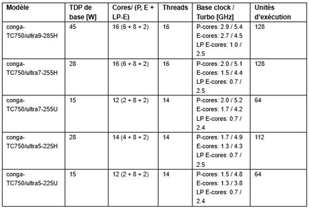 Les nouveaux modules conga-TC750 COM Express Compact sont disponibles dans les versions suivantes :