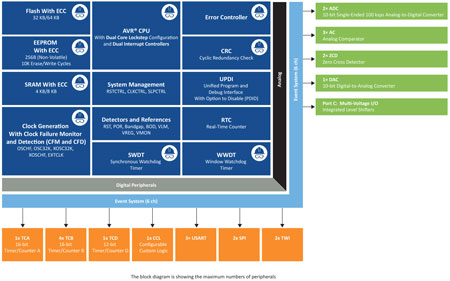Les caractéristiques matérielles de sûreté fonctionnelle comprennent un processeur double cœur en mode « lockstep », des doubles convertisseurs analogique-numérique (ADC), de la correction d’erreur (ECC) sur toutes les mémoires, un module de contrôle des erreurs dédié, des mécanismes d’injection d’erreurs, ainsi que des moniteurs de tension et d’horloge. Ces fonctionnalités permettent de réduire le temps de détection des fautes et la complexité logicielle. La famille AVR SD est capable de détecter les fautes internes rapidement et de manière déterministe, ce qui permet aux applications de respecter des objectifs de temps de détection des fautes (Fault Detection Time Interval - FDTI) jusqu’à la milliseconde, évitant ainsi les situations dangereuses et augmentant la fiabilité.