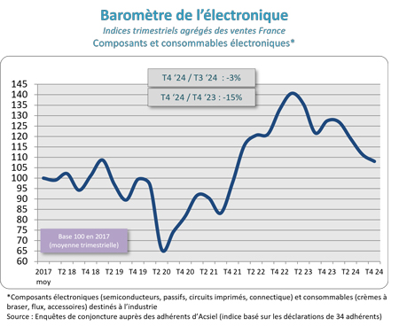 L’indice Acsiel des composants électroniques (semiconducteurs, passifs, circuits imprimés, connecteurs) et consommables s’est de nouveau contracté au quatrième trimestre 2024, en baisse séquentielle de 3% et de 15% en glissement annuel.