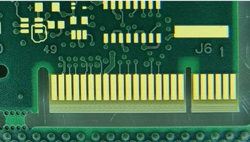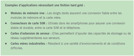 Connecteurs en bord de carte (Gold fingers) : Les connecteurs en bord de carte, souvent appelés « doigts dorés », sont l’une des principales applications de la finition hard gold. Les doigts dorés ou plages de contact, revêtus de nickel/or électrolytique, sont situés en bord de carte. Ils sont essentiels pour les modules électroniques et jouent un rôle clé dans la fluidité de la transmission des données entre les composants interconnectés pour les appareils de type ordinateurs, smartphones et équipements industriels.