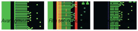Ces zones de contact à l’intérieur du circuit imprimé nécessitent ce que nous appelons une métallisation sélective. Chaque zone métallisée doit être connectée électriquement à l’extérieur de la zone du circuit imprimé, de la même manière que les nourrices que nous utilisons pour les connecteurs en bord de cartes. Ces nourrices peuvent être implantées sur les couches externes mais très souvent, les couches internes sont utilisées pour ces connexions.
