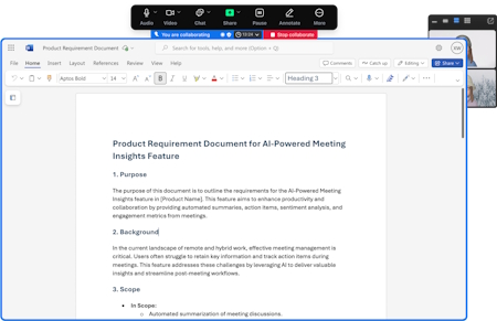 Une fois le fichier partagé ou créé, les utilisateurs peuvent ensuite collaborer directement dessus pendant les réunions grâce au partage d’écran automatique. Tous les participants peuvent apporter des modifications, ajouter des commentaires et y répondre en temps réel. Le document reste accessible après la réunion, conservant ainsi l’historique des échanges liés à ce fichier.