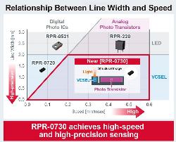 Avec l’augmentation de la sophistication et de l’automatisation des équipements industriels et de bureau, la demande pour une meilleure précision dans les technologies de détection est en constante évolution. Dans des applications telles que l’impression d’étiquettes, les systèmes de transport de matériaux ou de produits, ou encore la photocopie, il est essentiel d’avoir accès à une technologie permettant d’identifier des objets avec une grande précision. De plus, l’accélération due à l’amélioration de la productivité rend cruciale l’introduction de capteurs optiques à grande vitesse et à haute précision. Le RPR-0730 est un capteur optique compact fonctionnant par réflexion lumineuse (photo- réflecteur). Il emploie un VCSEL infrarouge, qui présente une meilleure directionnalité que les LED, ce qui facilite la détection d’objets fins. Par ailleurs, grâce à un phototransistor à sortie analogique en tant que récepteur, le capteur atteint un temps de réponse de 10µs. Cette combinaison de deux éléments permet une détection à grande vitesse et fiable de lignes fines de 0,1mm, qui étaient auparavant difficiles à détecter avec des sources lumineuses LED conventionnelles. En complément du capteur à sortie numérique existant « RPR-0720 », le RPR-0730 étend ses capacités aux applications nécessitant une détection plus rapide, comme la détection d’impression dans les copieurs et les imprimantes d’étiquettes, ou la détection de rotation dans les moteurs et les réducteurs.
