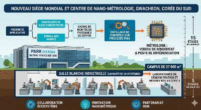 Park Systems a annoncé l’ouverture de son nouveau siège mondial à Gwacheon, en Corée du Sud. Le campus totalise 27 000 m², comprend 15 étages en surface et 5 en sous-sol, et intègre surtout une cleanroom industrielle capable d’accueillir jusqu’à 35 systèmes de métrologie.