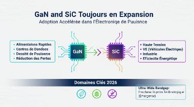 Les technologies GaN et SiC restent au cœur des roadmaps industrielles 2026, avec une forte croissance attendue dans le power et l’automobile.
