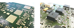 Les vias thermiques sont là pour remédier à cet état de fait. Ils servent de conducteurs électriques et thermiques au travers du matériau isolant. Leurs diamètres et leur nombre sont déterminants (voir photos ci-dessus), mais également l’épaisseur du laminé. En effet, plus le matériau isolant est mince, moins il isole, CQFD. Il est tout à fait possible de remplacer une couche de cuivre externe (Ou une partie de celle-ci) par une plaque d’aluminium qui, elle, constitue un radiateur de grande surface avec une forte inertie thermique. Depuis quelques années, Würth ElectroniK (Que nous remercions pour ces photographies) produit ces sandwiches hétérogènes permettant d’intégrer simplement une électronique de puissance dans un environnement confiné, tout en respectant une rigidité mécanique importante.