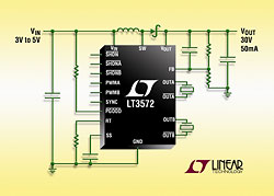 Le convertisseur élévateur 900 mA, intégré dans le LT3572, peut générer un courant de sortie jusqu’à 50 mA à 30 V sur une tension de batterie Li-ion en entrée. Sa fréquence de commutation peut être programmée entre 500 kHz et 2,25 MHz, ce qui permet l’emploi de très petits composants externes. Présenté en boîtier QFN de 4 mm x 4 mm, il procure une solution à empreinte très compacte.