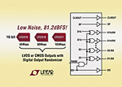 Une gigue très faible permet de garder un niveau important de SNR à des fréquences d’entrées élevées, conduisant à un SNR de 80,4 dBFS à 70 MHz, alors que le circuit échantillonneur / bloqueur, de grande linéarité, présente un SNR de 92 dBFS à 70 MHz. L’alimentation unique de 3,3 V nécessite moins de circuits annexes que les autres CAN qui requièrent deux alimentations. Echantillonnant à 105 Méch./s, le LTC2217 présente le fonctionnement avec SNR et SFDR des meilleurs de sa classe tout en ne consommant que 1190 mW, la moitié des CAN concurrents.