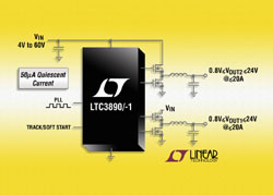 Linear Technology Corporation présente le LTC3890/-1, un contrôleur DC/DC, abaisseur, synchrone, de forte tension, à deux sorties, qui ne consomme que 50 µA avec une sortie active et 60 µA lorsque les deux sorties sont actives. Avec ses deux sorties à l’arrêt, le LTC3890/-1 consomme à peine 14 µA. La gamme de tensions d’entrée, de 4 V à 60 V, constitue une protection contre les impulsions de forte tension, permet d’assurer le fonctionnement dans les conditions de démarrage à froid pour l’automobile, et couvre une large gamme de sources d’alimentation d’entrée et d’éléments de batterie de différentes constitutions chimiques. Chacune des tensions de sortie peut être réglée entre 0,8 V et 24 V, pour des intensités de sortie jusqu’à 20 A, avec des rendements pouvant atteindre 95%. De ce fait il convient pour l’alimentation des systèmes de l’automobile de 12 V ou 24 V, des équipements lourds, du contrôle industriel, des applications de la robotique et des télécommunications.