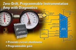 National Semiconductor Corp. (NYSE : NSM) a présente le premier amplificateur d’instrumentation programmable sans dérive, à diagnostic intégré. Le LMP8358 simplifie les mesures mettant en jeu un capteur de pression ou un thermocouple, en permettant aux utilisateurs de détecter les courts-circuits, les circuits ouverts et autres mauvais contacts, dans le cas d’applications industrielles à distance. Cette capacité de diagnostic évite les pannes dans les instruments médicaux, les balances de précision, les capteurs de pression ou les systèmes de contrôle moteur.