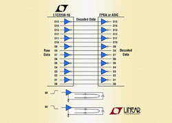 Pour combattre cet effet, le mode propriétaire, à polarité alternée des bits (ABP) du LTC2259-16, inverse tous les bits des lignes impaires avant les tampons de sortie pour égaliser le nombre de 1 et de 0 qui commutent. Cette méthode annule les forts courants de masse qui contribuent au retour des signaux numériques. En plus du mode de polarité alternée des bits, un générateur de données aléatoires de sortie est disponible, en option, pour réduire les interférences provenant des sorties numériques. Ce générateur dissocie la sortie numérique pour réduire la probabilité de présence de codes répétitifs venant en boucle de retour se coupler à l’entrée du CAN, ce qui causerait des fréquences indésirables dans le spectre de sortie. Les deux techniques de réduction du signal de retour numérique permettent d’améliorer la gamme dynamique sans parasites (SFDR) de 10 à 15 dB. Fonctionnant à partir d’une tension analogique de 1,8 V, le LTC2259-16 présente un rapport signal / bruit (SNR) de 73,1 dB et une gamme dynamique exempte de parasites (SFDR) de 88 dB en bande de base. Une gigue de très faible niveau, de 0,17 psefficace ,permet un sous-échantillonnage pour des fréquences FI, avec un niveau de bruit excellent. Le LTC6406 est recommandé en tant que pilote de CAN, rail-à-rail, pour assurer le fonctionnement en AC du LTC2259-16.