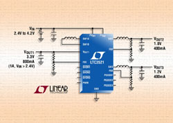 Le LTC3521 comprend un convertisseur DC/DC abaisseur - élévateur, synchrone, 1 A, et deux convertisseurs DC/DC, abaisseurs, synchrones, 600 mA, procurant trois rails de tension de sortie avec des rendements de l’ordre de 95%. La gamme de tensions d’entrée du LTC3521, de 1,8 V à 5,5 V, le rend compatible avec tous les types de ports de cartes de PC, applications alimentées sur port USB et une batterie d’accumulateurs à un élément Li-ion ou deux ou trois éléments NiMH / NiCd / alcaline. L’architecture intégrée dans le canal abaisseur – élévateur synchrone du LTC3521 permet une transition continue entre tous les modes de fonctionnement, ce qui le rend idéal dans les applications qui génèrent une tension de sortie fixe même lorsque la tension de batterie tombe en dessous de la tension de sortie. Dans beaucoup de cas, cela peut accroître l’autonomie sur batterie jusqu’à de 20%. Son canal abaisseur – élévateur peut générer des tensions de sorties fixes comprises entre 1,8 V et 5,25 V, tandis que chacun de ses canaux abaisseurs peut générer des tensions de sortie de 0,6 V à 5,25 V, ce qui le rend idéal pour une large gamme d’applications portables. La fréquence de commutation, de 1 MHz, du LTC3521 permet un fonctionnement à faible niveau de bruit, et de réduire la taille des composants externes. La combinaison de petits composants externes et du boîtier QFN-24, 4 mm x 4 mm, conduit à une solution d’empreinte compacte pour les applications à espace restreint.