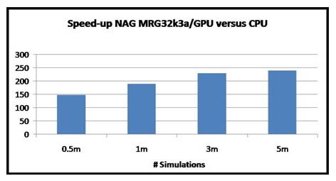 La dernière version des fonctions NAG pour GPU inclut des routines destinées aux simulations de Monte Carlo — générateurs de nombres quasi et pseudo aléatoires, pont brownien, et distributions statistiques associées. Pour plus d’informations, voir http://www.nag.com/numeric/GPUs.