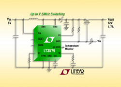 Les commutateurs à faible tension VCESAT du LT3579, 0,25 V (associés pour 5,5 A), permettent d’atteindre des rendements de 90%. Avec les deux commutateurs combinés, sur une tension d’entrée de 5 V, le LT3579 peut fournir jusqu’à 1,7 A sous 12 V ou 1,2 A sous – 12 V. Pour de fortes tensions en sortie, le commutateur esclave du LT3579 autorise des architectures à pompes de charges, de très fort rendement, qui ne requièrent que très peu de composants externes. La fréquence de commutation du LT3579 peut être programmée, via une résistance unique ou synchronisée à une horloge externe, entre 200 kHz et 2,5 MHz, ce qui permet de réduire la taille des composants externes et d’éviter les bandes de fréquences sensibles au bruit. L’arrêt en cas de sous tension (UVLO) est réglable par l’utilisateur pour des performances optimales du système. Une résistance unique dans la boucle de régulation détermine la tension de sortie, ce qui réduit le nombre de composants externes. Les autres caractéristiques incluent la possibilité d’une synchronisation externe et de la gestion de la température de jonction.