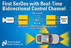 National Semiconductor Corp. (NYSE : NSM) a dévoile sa famille de chipsets SerDes (sérialiseur- dé-sérialiseur) de classe automobile FPD-Link III, offrant pour la première fois un canal de contrôle bidirectionnel temps-réel pour les caméras d’assistance à la conduite. Les chipsets FPD-Link III améliorent la sécurité et le temps de réponse du conducteur, en acheminant l’horloge, les données, et le contrôle I2C bidirectionnel temps-réel, en continu sur une seule paire différentielle.