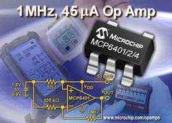 Microchip annonce le lancement des amplificateurs opérationnels MCP6401/2/4 venant compéter son portefeuille existant d’amplificateurs opérationnels à usage général en offrant une faible consommation dans des boîtiers de taille réduite. Avec un courant de repos d’à peine 45 µA pour un produit gain-bande passante (GBWP) d’1 MHz, les amplificateurs opérationnels MCP6401/2/4 s’accordent avec les microcontrôleurs PIC® très faible consommation de Microchip. Ils permettent d’améliorer la durée de vie des batteries de nombreuses applications telles que, entre autres, les baladeurs MP3, les appareils électriques et consoles de jeu (produits grand public), les scanners de codes barres industriels et les compteurs de gaz, les capteurs de proximité et de mesure de la pression des pneus des appareils de prétraitement de signal dans les systèmes pour l’automobile ainsi que les applications médicales telles que des glucomètres et appareils portatifs de surveillance des patients.