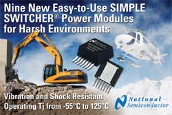National Semiconductor Corp. (NYSE : NSM) présente neuf nouveaux modules d’alimentation SIMPLE SWITCHER® à température de fonctionnement étendue, résistants aux chocs et vibrations pour l’utilisation en environnements rudes. Les modules d’alimentation robustes et facile à utiliser LMZ10503/4/5EXT, LMZ12001/2/3EXT et LMZ14201/2/3EXT combinent le rendement d’un régulateur synchrone à découpage et la simplicité d’un régulateur linéaire, éliminant l’inductance externe et les problèmes d’implantation typiques des régulateurs à découpage.